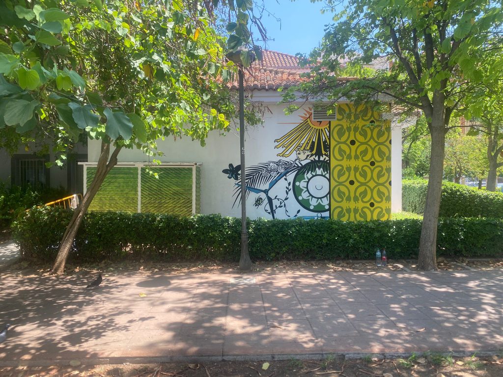 L’Oficina de l’Energia, situada al Parc de l’Oest de València, ha triat un mural artístic de gran format que convida a reflexionar sobre el vincle ancestral entre els elements naturals: sol, vent i aigua, i la seua rellevància en la transició cap a un model energètic sostenible, col·lectiu i conscient.